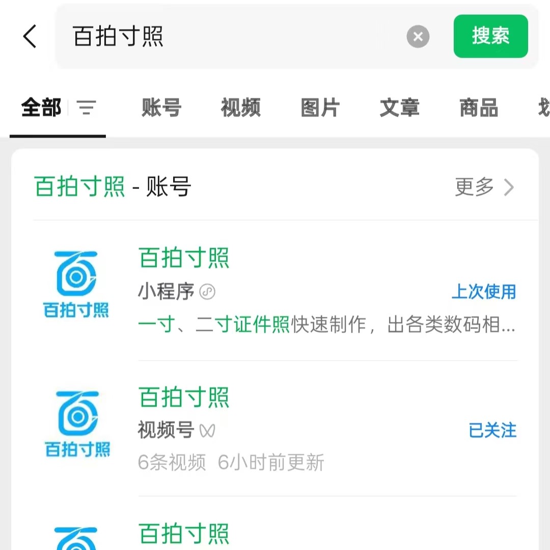 第一步、打开微信搜索“百拍寸照”小程序/关注公众号快速办理。
